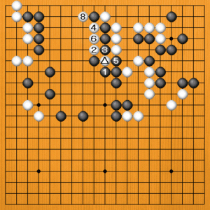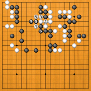 黒1とツイでも、白2とツガれると、白の侵入は止まりません。黒3とハネても、白4のアテから6とアテて8のツギまで、上辺を荒らされてしまいます。 |
