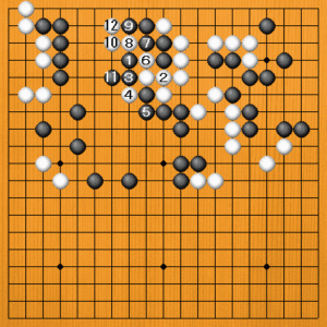 黒1とトンでも、白2とツガれると、後がうまくいきません。黒3とオサえれば、白4のアテから6、8と出切って黒の傷が深刻です。白12とオサえれば、上辺の黒が取られです。 |