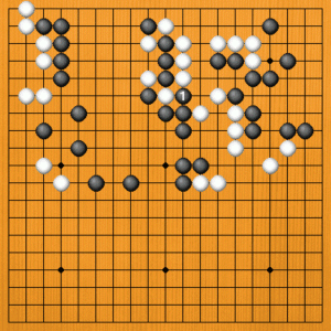 B=黒3は仕方ありません。黒1と打ってしまうと、白の侵入を防ぐことはできないのです。 黒3で、(次の図へ) |