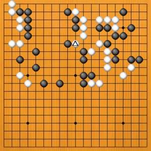 (失敗の原因) A=黒1のオサエが失敗の原因でした。黒1の前に大事な手があったのですが、それは後ほど説明します。 |