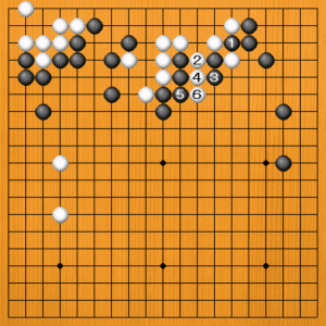 初めに黒1と切ってもうまくいきません。白2のアテから4と出る手がまたアタリになります。黒5とツイでも白6と出られて止められません。 |