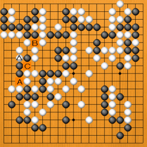 白△とアテコんだところです。次の一手を、A~Cの選択肢の中から示してください。 |