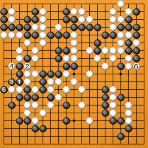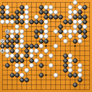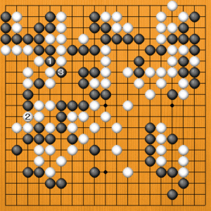 実戦は、黒1にやむなく白2とツギましたが、黒3と切れば上辺の白が落ちていますから黒が優勢です。 |