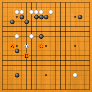 白△とケイマに構えたところです。次の一手を、A~Cの選択肢の中から示してください。 |