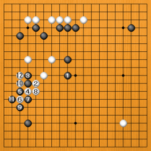 黒1に白2とコスミツけてくれば、黒3のハネから5とアテて7とノビるのが厳しくなります。白8の押しには、黒9から13まで強引に分断します。白18とカカえて生きることは出来ますが、黒21と切れば、黒が大優勢です。 |