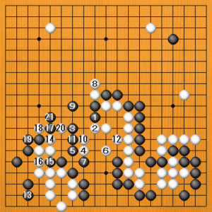 (実戦) 黒1から3とケイマしたのが手筋で、白は真っ向から受けるのは無理があります。それで、実戦では白4のケイマで妥協したのですが、黒5から7と整形して、白を中に封じ込めました。白8のノビを一つ決めたのですが、黒9のトビに石が来て黒が補強されたのが大きい。白12まで二眼作ってこちらは生きましたが、黒13とサガって今度は隅の白の眼を奪います。白14とマゲても、黒15と出て眼を取りながら黒17とハネて出口を塞ぎます。白18、20とアテても、黒21とノビて逃げられません。黒9に石が来たのが白にとっては致命傷になりました。 |