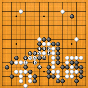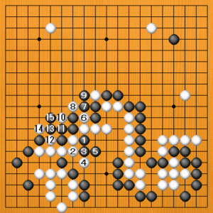 黒1から切るのが強烈です。白2のツギに黒3のオサエから5とマゲれば、中央の白に眼形がありません。白6から8と出切って来ても、黒9と出て大丈夫。白10のアテから12、14とやってきても、黒15まで出れば捕まりません。ここまでヨミ切ってこそ、豪快な手が決まるわけです。 |