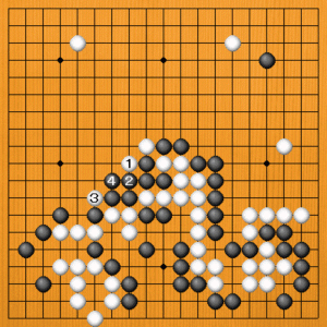 黒1の方を切ったのでは、これまでの苦労が水の泡です。黒3とこちらを止めても、白4のノゾキが好手で、白が連絡してしまいます。 |