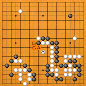 金八段の先番です。 白△とトンで整形したところです。次の一手を、A~Cの選択肢の中から示してください。 |