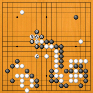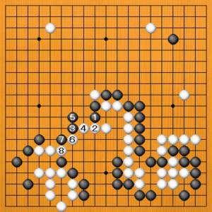 白1の切りから3とアテて5と押します。黒6とシチョウを避ければ、白7のツケが手筋です。黒数子が捕まっています。 |