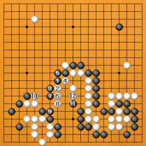 黒1(C)のコスミは工夫した手ですが、これも白の追及には今一つです。白2のツケから4とフクらんで、白6、8とノビるのが白のシノギの筋です。黒9のツギには白10とマゲることが出来ます。すでに中央の白は生きているのです。黒11のコスミには白12とブツカッて不安はありません。 |