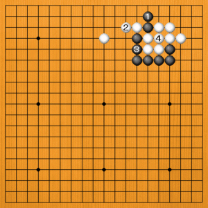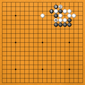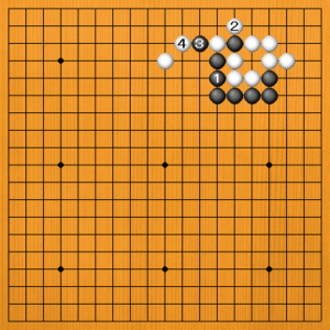 黒1(A)のアテを決めてはいけません。白2と抜かれると手掛かりがなくなります。黒3とオサえても、白4とコスミツけられると後がありません。 |