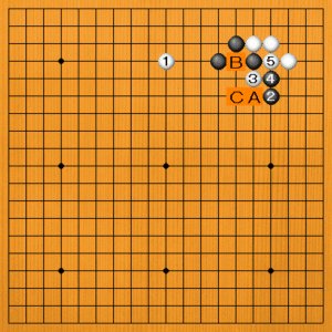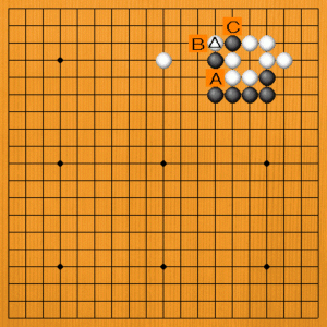 白1のハサミには黒2とケイマするのが形です。そこで白3とツケコシて、黒4に白5とアテたところです。次の一手を、A~Cの選択肢の中から示してください。 |
