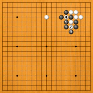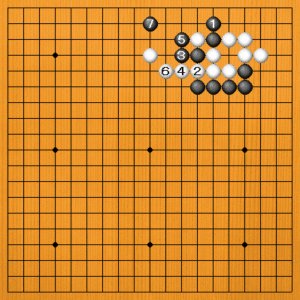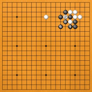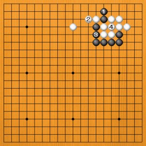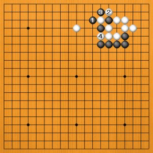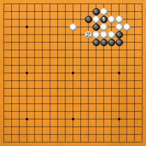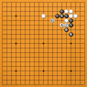 黒1には白2とノビられます。黒3のアテは利きますが、黒1とノビた二子は持ち込みです。上辺がいい地になってしまいました。 |