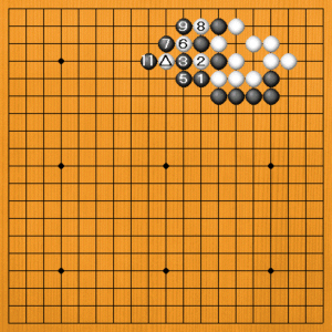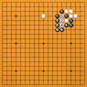黒1には白2と一つノビてくるかもしれませんが、黒3とカケて外側を止めます。白4と一つ出ることは出来ますが、黒5のオサエには白6と抜くしかありません。黒7とアテてシボれば、白はダンゴ石になっています。黒9のツギまで黒の厚みが圧倒的です。 |