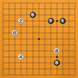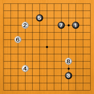 (手順) 黒1から7のシマリのときに、白8と一間高ガカリをしてきました。 |
