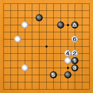 (正解) 黒1(A)の下ツケが正解です。白2、4に黒5までは19路盤でもよく打たれている定石ですが、黒△があるので白6のヒラキが窮屈です。黒が満足できる進行です。 |