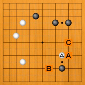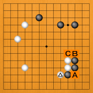白がナダれて△をオサえた場面です。黒番で候補手A・B・Cのどこに打ちますか? |