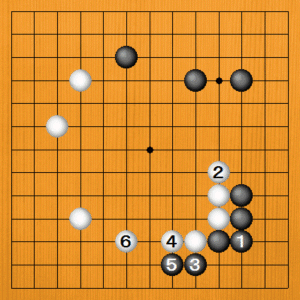 黒1(A)のツギは失敗です。部分的はしっかりした手で、白2から6までは定石通りですが、全局的に見ると黒は隅に偏り過ぎで、白の模様のほうがまさります。 |