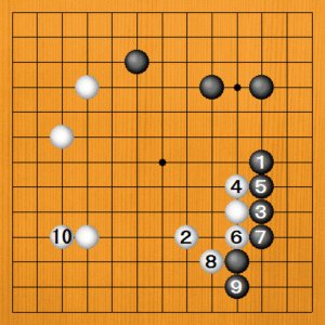(手順) 前問の続きです。黒9の下ツケに対して、白10、12とナダれてきた所です。 |