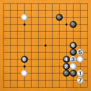 (手順) 白8のスコップ定石に対して、黒9と迫ってきたところです。 |