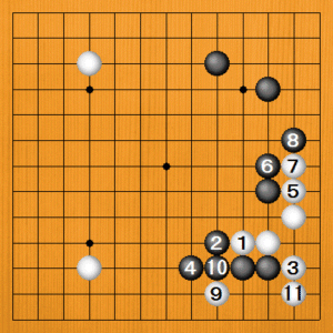 (手順) 黒1から5の布石に、白6、8と打ってスコップ定石が出現しました。黒は9とサガった場面です。 |