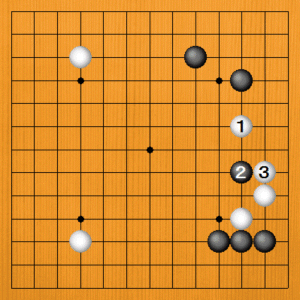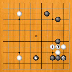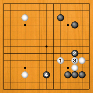 黒1に白2とカドに打つのが13路盤ならではの手です。黒3には白4とコスミます。黒地を白いスコップで掘り起こしているようなイメージを持ってください。 |