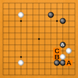 黒△に対して白はどう応じるべきですか? 白番で候補手A・B・Cのどこに打ちますか? |