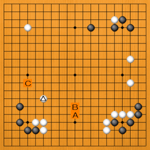 白△と下辺の模様を広げてきました。一力七段は候補手A・B・Cからどの手を選んだでしょうか? |
