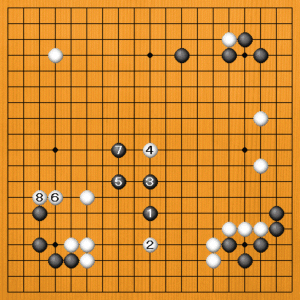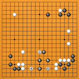 (4図) 実戦は黒1に白2と上からボウシしてきました。黒3と一間トビで踏み込みます。白4には黒5とトビ、白6とツメてきたら黒7のツケから脱出します。 |