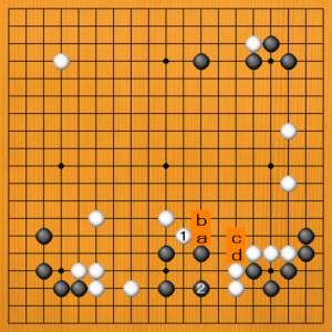 (5図) 実戦は4図の白6で、白1と攻めてきましたが、黒2と受けて、この形になれば黒は取られることはありません。後に黒a、白b、黒cと脱出すれば、dの切りが狙えます。 |