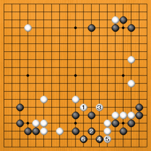 (6図) 白1、黒2に白3と封鎖してきたら、黒4、6で簡単に生きることができます。 |