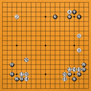 (手順図) 黒17まで黒は地をしっかり取っています。白は18のツメから下辺に模様を広げた場面です。 |