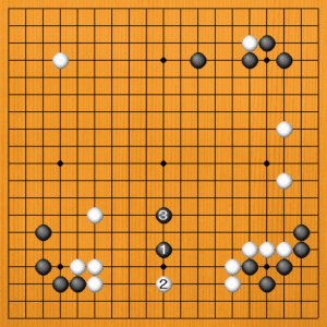 (正解・3図) 黒1(A)まで踏み込むのが正解です。白2と受けてくれば黒3と逃げますが、2図と比べて下辺の白地をかなり圧迫することができています。 |