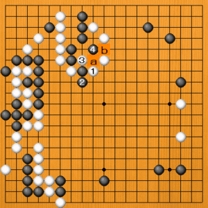 (8図) 7図に続いて白1とコスミツケてきても、黒2から4のノゾキで、次に黒aとbが見合いですから、白の包囲を破ることができます。 |