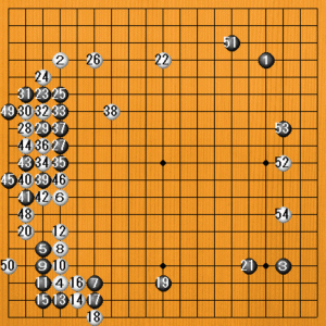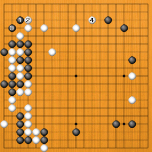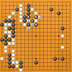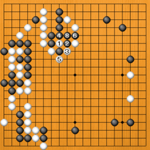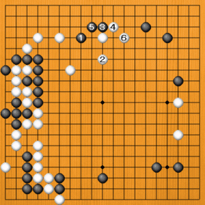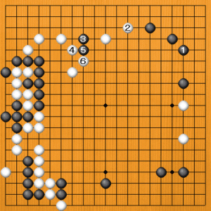 (手順図) 左辺の戦いが一段落して、白六子は取れていますが、左下の黒もほぼ取られています。 白は右辺をワリ打ちしました。 |