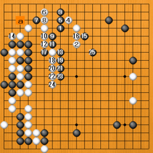 (11図) 黒1~13のときに、実戦は白14と守ってきました。これを省くと、黒18などと封鎖されてから黒aの三々に入られて、全体の白が危なくなってしまいます。 黒は15のノゾキから黒19と押していきます。白20から24までとノビられても左辺の黒は完全に生きているので、黒にはまったく不満はありません。続いて黒25とケイマすれば、上辺の白四子を攻めることができます。 |