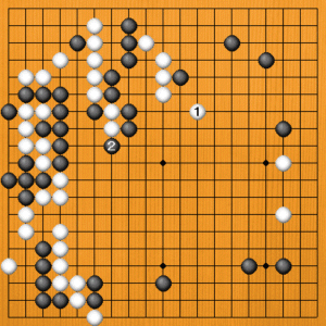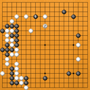 (12図) 実戦は前図の白20で白1とケイマにしてきましたが、黒2とアテて白二子を制するのが気持ちのいい手で、この進行は黒成功です。 |