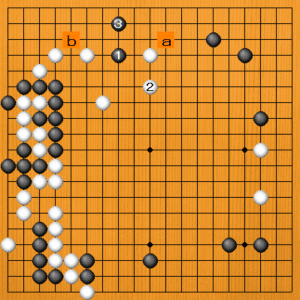(5図) 実戦は黒3とトビました。これは次にaとbを見合いにしています。 |