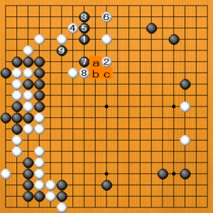 (6図) 黒1、3に白4から6と打ってきたら、黒7、9で脱出します。左上隅の白も危なくなり、黒a、白b、黒cの狙いもあるので、これも黒成功です。 |