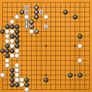 (7図) 黒1、3に対して、実戦は白4、6と攻めてきましたが、黒7のノゾキを利かしてから黒9から13までと中央に進出して黒成功です。 |