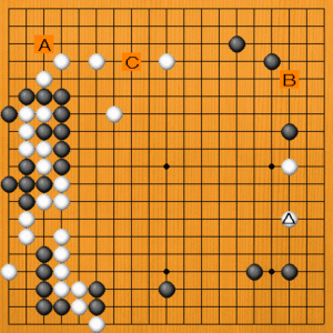 白が△と右辺をヒラいたところです。 一力七段は候補手A・B・Cからどの手を選んだでしょうか? |