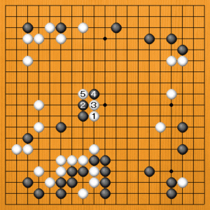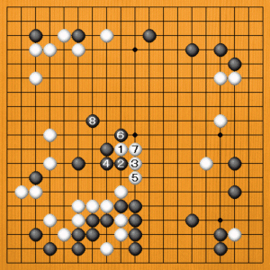 (8図) そこで、白1、黒2のときに白は3とハネました。ここで黒4の引きだと、白5と二段バネしていい形で黒を封鎖することができます。 |