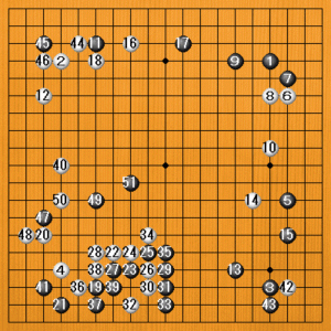 (手順図) 白44の時点で、黒は下辺、右下が確定地で、白は左辺に模様を張っています。左辺の白模様を黒がどのように荒らすかが焦点でしたが、黒は45の三々を利かし、黒47から51のケイマで消してきたところです。 |