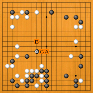 黒が△とケイマしたところです。 一力七段は候補手A・B・Cからどの手を選んだでしょうか? |
