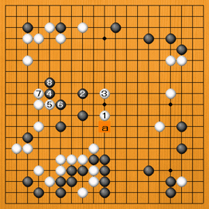 (1図) 白1(A)のボウシは不正解です。黒2のトビに白3と攻めても、黒4の肩ツキから黒6、8と受けられて、なかなか黒の眼を奪えない形です。黒aなどの薄みも残り、これは白の大変な進行です。 |