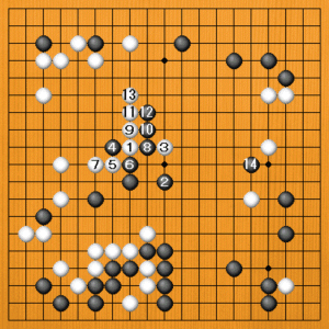 (2図) 白1(B)のボウシも不正解です。黒2に白3と攻めると、黒4とツケられる薄みがあります。白5のハネ出しから白7は黒8から分断されます。白地もかなり増えたのですが、黒14あたりに打たれて、右下一帯が大きな黒模様になってしまうおそれがあります。 |
