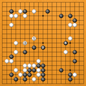 (3図) 白1、黒2に白3と守るのも、やはり黒4と打たれて右下が大きくなりそうです。白は後の打ち方がたいへん難しくなります。 |