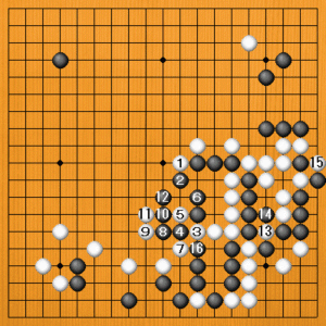 (8図) 7図の白9で、実戦は白1のハネを打ってから白3と手数をのばしてきました。難しい変化はありますが、黒16までと中央を取ることができました。 |