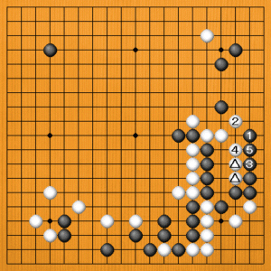 (4図) 黒1に白は2とコスんできました。ここで黒3とワタリます。白4とノビて白△二子を助けてきたら黒5とツギ、ここで白は守り方が難しい。右辺の黒が取られる心配はありません。 |